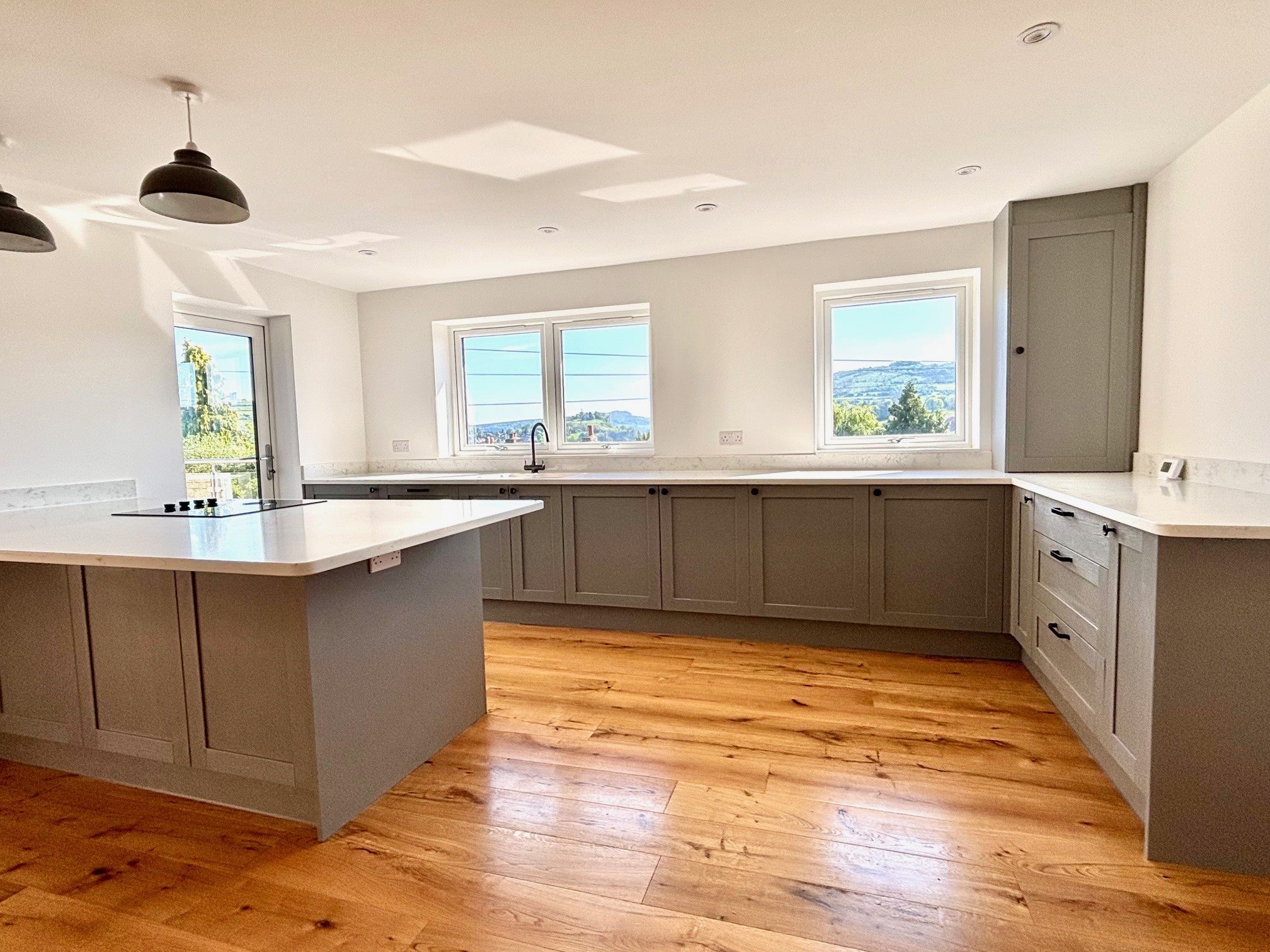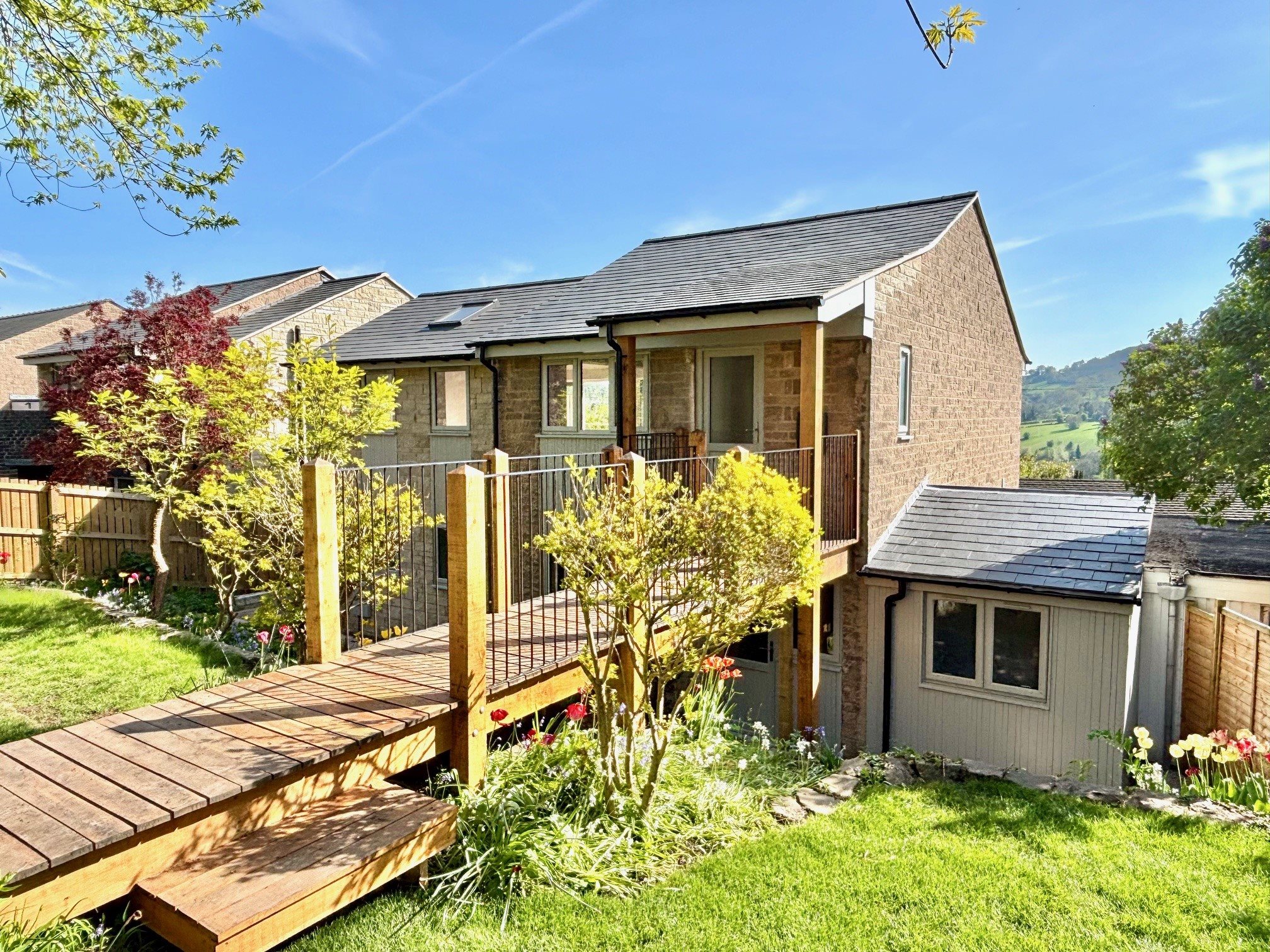 DESCRIPTION – A stylish contemporary home, superbly renovated, extended and adapted to provide open plan living, with distant views from a convenient town location. The property boasts spacious open plan living to the upper floor with access to a broad balcony, which takes full advantage of the superb views across the town and towards the surrounding hills. There is a modern well equipped kitchen and direct access through the roadside gardens at first floor level, whilst on the ground floor, three double bedrooms, two bathrooms and a utility room. Outside, mature gardens offer opportunity for relaxation and recreation, plus there is the added benefit of ample off-street parking and a single garage.