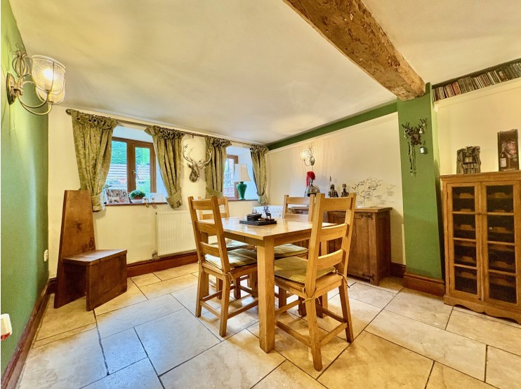 Dining room – 5.06m x 3.18m (16’ 7” x 10’ 5”) the longer measurement extending beneath the stairs creating a generous reception room with ample space for formal dining. There are wall light points, high shelving and two double glazed windows facing the rear gardens. Again, there is a limestone tiled floor and a decorative glazed period pine door opening to the…