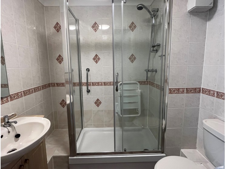 Shower Room being fully tiled and comprising a double shower cubicle with mains control shower, wash hand basin with vanity unit below and low flush wc. There is a coved ceiling and Creda wall mounted fan heater.