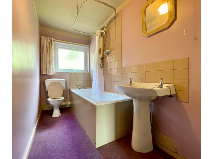 Bathroom – comprising panelled bath with shower over, pedestal wash hand basin and WC. Rear facing obscure glazed window.