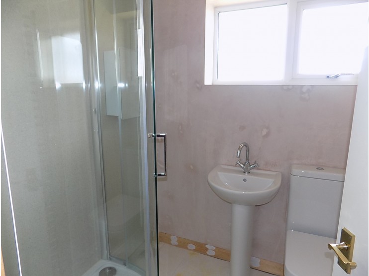 Shower Room being recently refurbished to provide a spacious quadrant shower cubicle with fully shower boarded walls and sliding curved glazed shower screen door, mains shower control, low flush wc, pedestal wash-hand basin, inset ceiling spotlights, tall towel rail radiator and UPVC sealed unit double-glazed window.