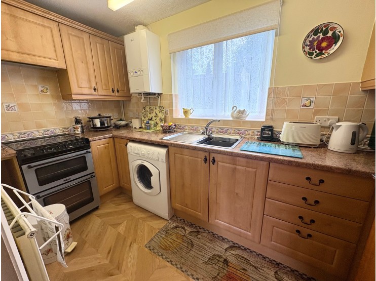 Kitchen 3.48m x 1.66m (11’5” x 5’5”) comprising a comprehensive range of wall and base units and drawers, worksurface with inset stainless-steel sink and drainer unit, tiled splashback, appliance space for for a fridge freezer, washing machine and electric cooker. Blanco extractor hood, wall mounted Ideal gas central heating boiler, UPVC double-glazed window and radiator.