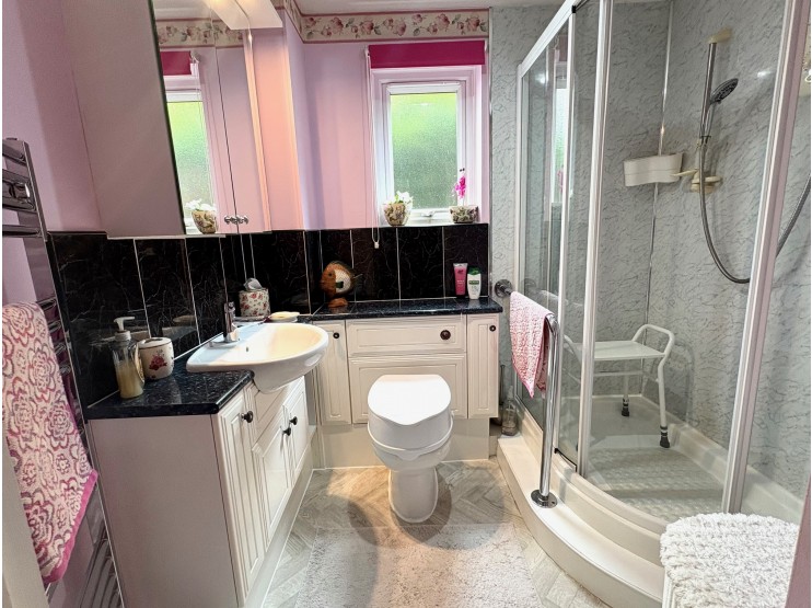Shower Room 2.18m x 1.81m (7’2” x 5’’11”) comprising a shower cubicle with Mira Sport electric shower, wash-hand basin with vanity unit below, low flush WC, tiled splashback, UPVC double-glazed window and heated towel rail.