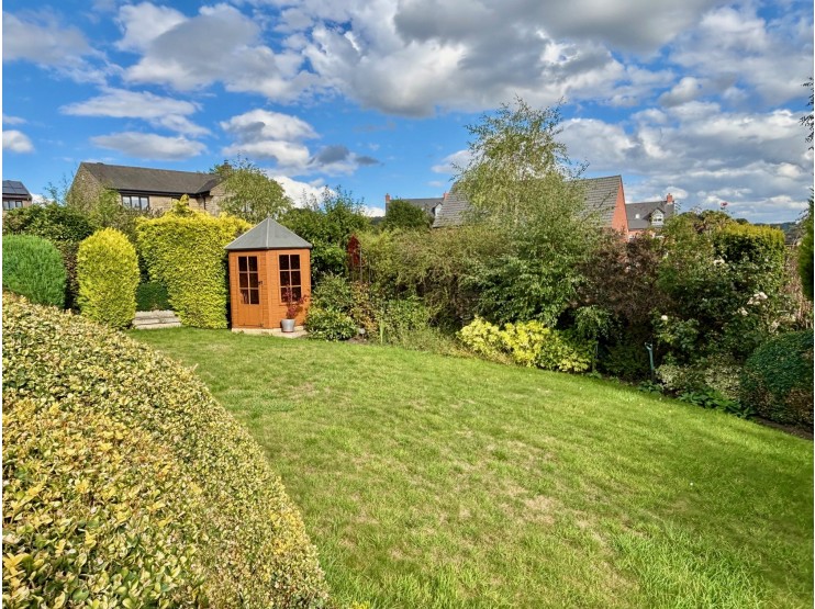 A small stone paved patio by the conservatory allows similar vantage and from this level short steps descend to the main garden. It is immediately evident the gardens, as with the house, have been cared for and enjoyed over many years. Mature shrub borders provide colour height and year-round interest; all set around a central lawn. Leading through a rose arbour, the lawn extends to a part hidden corner, where there are productive fruit beds, apple trees and greenhouse.