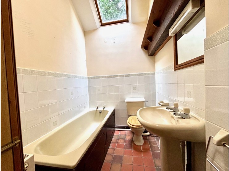 Bathroom – 2.80m x 1.70m (9’ 2” x 5’ 7”) fitted with a coloured suite, roof light to the part vaulted ceiling. The suite includes a panelled bath, WC and wash hand basin. Quarry tiled floor, ceramic tiling to the walls and a built-in store houses the gas (LPG) fired boiler which serves the central heating and hot water system.