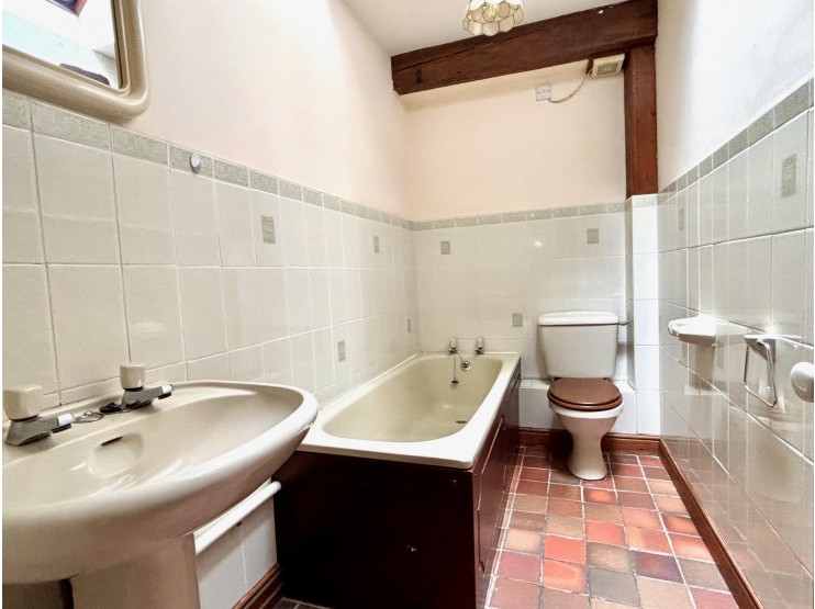 Bathroom – 2.36m x 1.19m (7’ 9” x 3’ 11”) fitted with a panelled bath, WC and wash hand basin. There is tiling to half height, contrasting tiled floor and Velux roof light.
