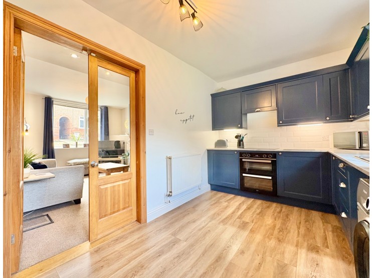 Dining kitchen – 4.33m x 3.25m (14’ 2” x 10’ 8”) recently refitted with dark blue Shaker style cupboards and drawers, marble effect worktops, which incorporates a stainless steel sink unit and drainer and induction hob with extractor above. There is an under counter electric oven, space for washing machine and fridge freezer. With laminate flooring, ample space for daily dining, door allowing external access and window facing the rear garden.