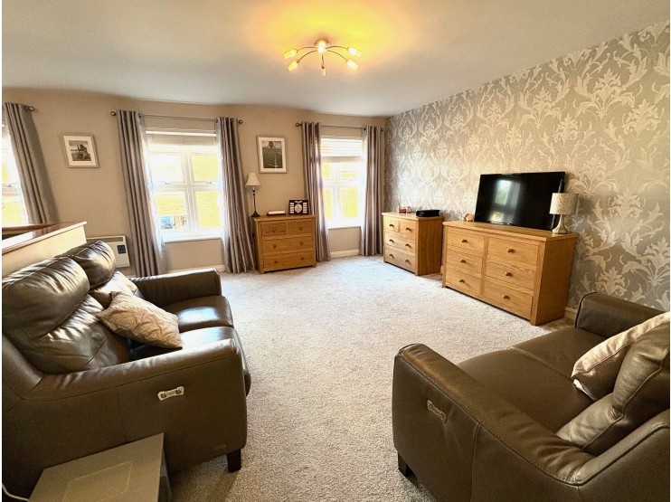 Family Bathroom 2.60m 1.91m (8’6” x 6’3”) overall measurements. Comprising bath with mixer tap, low-flush wc and wash-hand basin, tiling to half height, tiled flooring, heated towel rail and side aspect UPVC double-glazed window.
