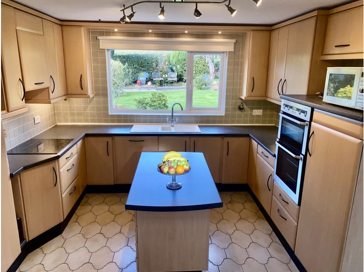 Comprehensively fitted Breakfast Kitchen 3.86m x 3.44m (12’8” x 11’3”) having ceramic tiled floor and a comprehensive range of fitted units providing base cupboards and wall cupboards, with drawer banks, tall double-opening shelved larder cupboard with double cupboard over, integrated double oven, ample round edge work surfaces with inset single drainer 1.5 bowl sink unit and an inset four burner electric hob with extractor fan over. Integrated refrigerator and integrated dishwasher. Part full-height ceramic wall tiling, pelmet and work top lighting. There is a central matching island unit with worktop/breakfast bar and drawers beneath. UPVC sealed unit double-glazed window overlooking the rear garden and door to the exterior side.
