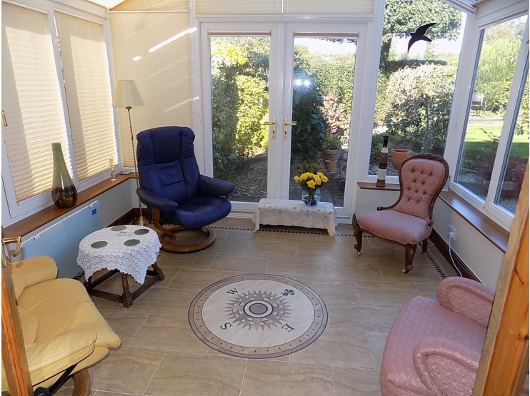 Conservatory 3.5m x 3.25m (11’6” x 10’8”) being of UPVC sealed unit double-glazed construction over a masonry base, with Amtico flooring featuring a compass motif, there are two sets of double-opening doors to the exterior garden, fully fitted blinds.