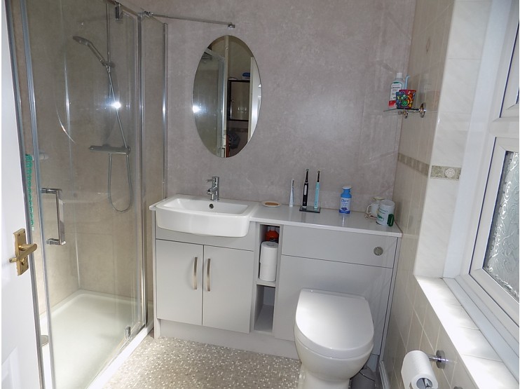 Ensuite Shower Room with part ceramic tiled and part water-proof shower boarded walls, contemporary three-piece suite in white, comprising low-flush wc with wash-hand basin in vanity unit with cupboard beneath, large walk-in shower cubicle with mains shower control. Towel rail, radiator and sealed unit double-glazed window.