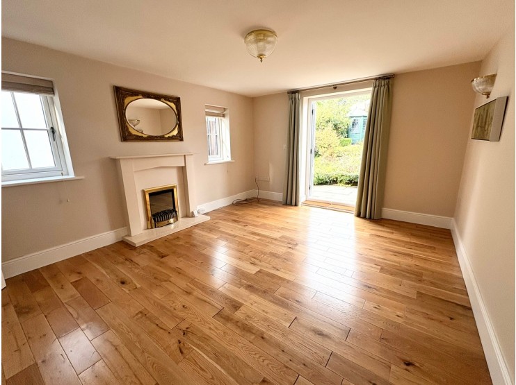 Sitting Room 4.45m x 3.58m (14’8” x 11’9”) with engineered oak flooring and attractive polished marble effect fireplace with matching hearth and fitted decorative coal effect electric fire. Radiator, two wall light points, two upvc double glazed side aspect windows and upvc double glazed French doors opening onto the rear garden.