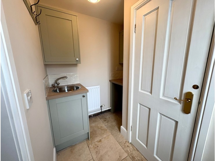 Utility Room being ‘L’ shaped with maximum overall measurements of 2.4m x 1.93m (7’11” x 6’4”) to include the cloakroom. With ceramic tiled floor, radiator and stainless steel circular sink unit with mixer tap set into work surface with cupboard under and wall unit above. Space and plumbing for a washing machine with worksurface over and further double opening wall cupboard above. A door opens into the cloakroom and a upvc double glazed stable style door leads to the rear garden.
