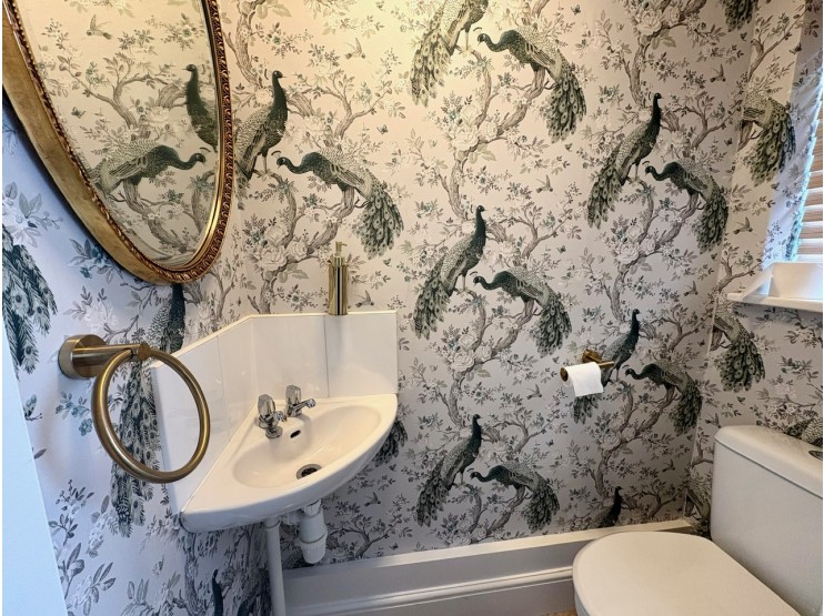 Cloakroom having fitments in white comprising low flush wc and corner wash hand basin. Upvc double glazed window and ceramic tiled floor.