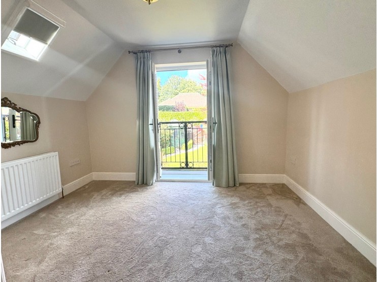 Master Bedroom Suite 4.46m x 3.58m (14’8” x 11’9”) measurements include the ensuite. Having an in-built wardrobe/cupboard with fitted shelf and hanging rail, two roof light windows, radiator and upvc double glazed French doors opening onto a Juliette balcony overlooking the delightful rear garden. A door opens to the