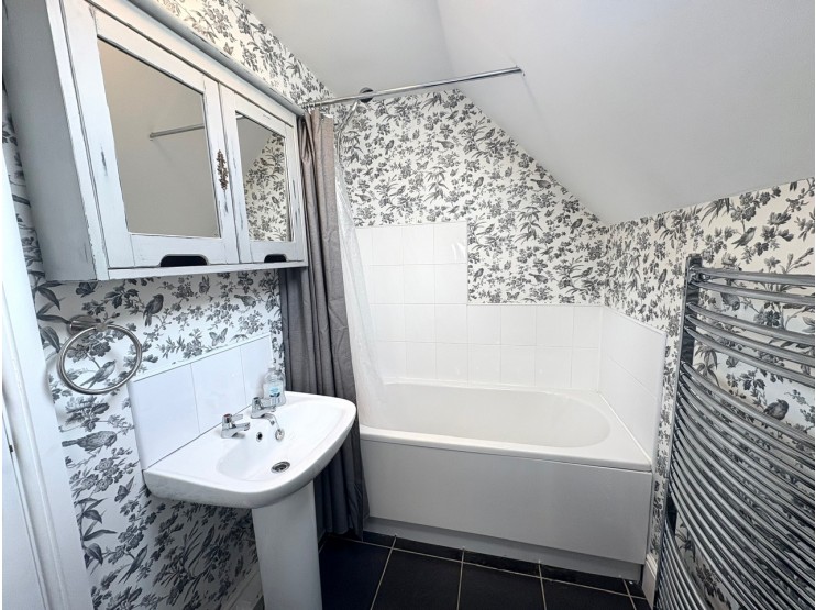 Family Bathroom 2.40m x 1.53m (7’10” x 5’0”) having a three-piece suite in white comprising panelled bath mixer tap and shower head, pedestal wash hand basin and low flush wc. Partially tiled walls, ceramic tiled flooring, roof light window and curved heated towel rail.