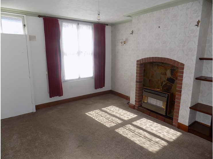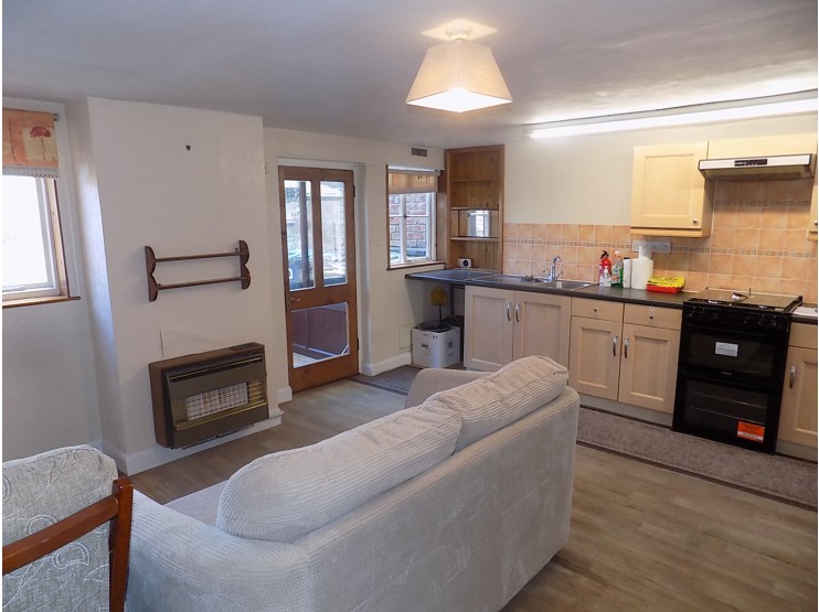Large Living Kitchen 4.92m x 4.47m (16’1” x 14’8”) with staircase off to first floor and understairs storage area with quarry tiled floor. Windows to front and side, door to rear porch and wall-mounted gas fire. Double panel central heating radiator. The Kitchen area is fitted with a good range of base cupboards and wall cupboards with ample round edge worksurfaces, having inset single drainer stainless steel sink unit and mixer tap. Ceramic tile splashbacks, gas cooker point and appliance space with plumbing for automatic washing machine.