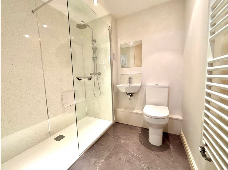 Shower room – 1.85m x 1.66m (6’ 1” x 5’ 5”) recently upgraded to include a large walk-in shower with glazed screens and main shower fitting, WC and wall hung wash hand basin. There is a heated towel rail, shaving point and extractor fan.