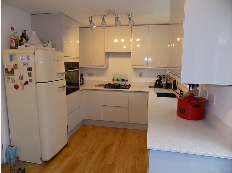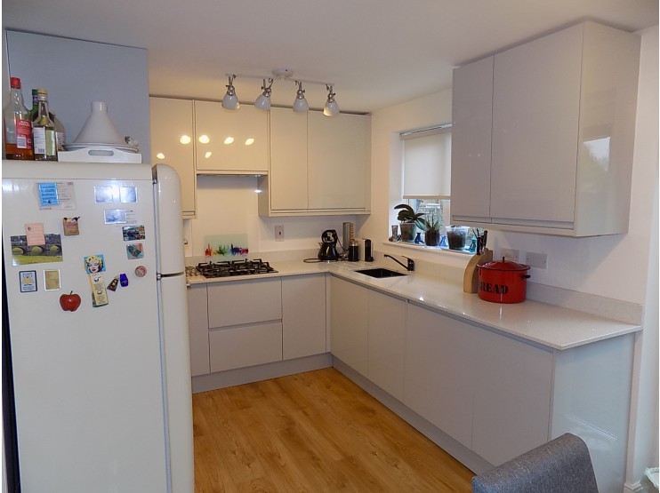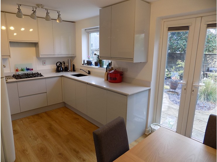 Comprehensively Fitted Dining Kitchen 4.48m x 2.66m (14’8” x 8’8”) having an excellent range of contemporary kitchen units providing base cupboards and wall cupboards, drawer bank and matching oven housing with Lamona electric oven, extensive quartz worksurfaces with matching upstand, inset four burner Lamona gas hob with cooker hood over. Fitted 1.5 bowl sink unit with mixer tap and worktop drainer. Integrated dishwasher and integrated washer dryer. UPVC sealed unit double-glazed window overlooking the rear garden and double-opening UPVC sealed unit double-glazed French doors with integrated blinds. Double panel central heating radiator. The Kitchen houses a wall-mounted gas fired boiler for domestic hot water and central heating, enclosed within a wall cupboard.