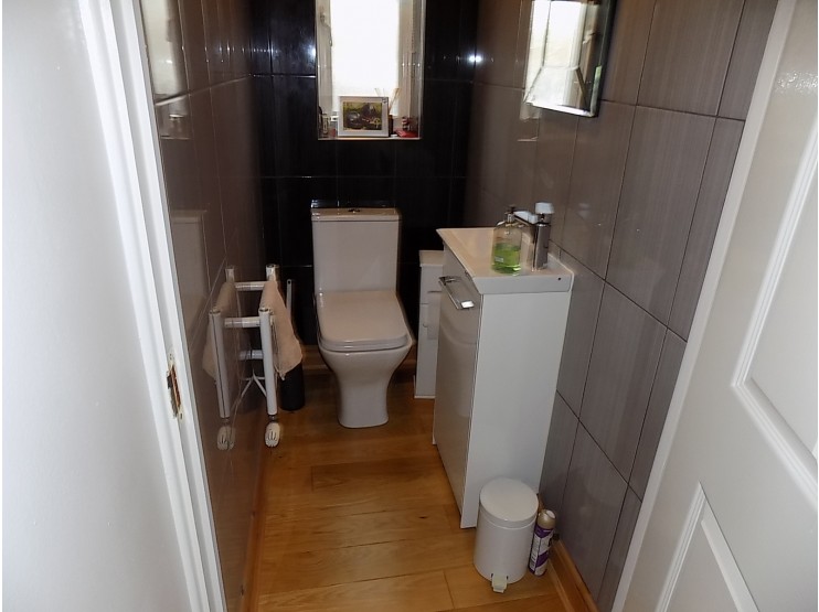 Guest Cloakroom having contemporary fitments in white, comprising low-flush wc and wash-hand basin with vanity cupboard beneath, fully tiled walls, sealed unit double-glazed window, towel rail radiator, oak floor.