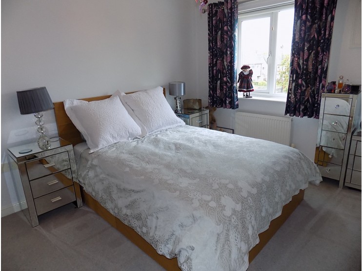 Bedroom Two (rear) 3.95m maximum measured to the rear of the wardrobes x 2.62m (12’11” x 8’7”) with single panel central heating radiator and UPVC sealed unit double-glazed window. Two double inbuilt wardrobes, both with hanging rails and shelves.