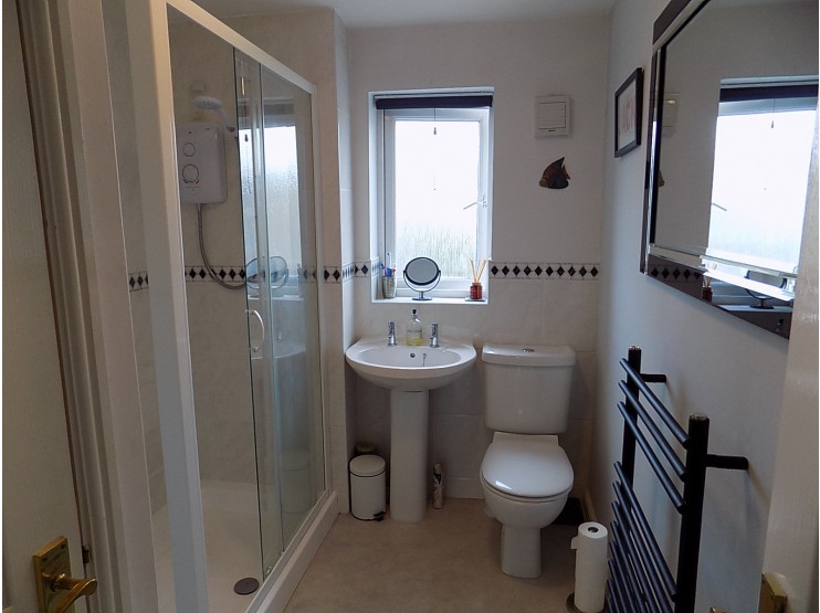 Shower Room being of spacious proportions with fitments in white, comprising large fully tiled shower cubicle with glazed shower screen and sliding door, fitted Mira Sprint electric shower, pedestal wash-hand basin, low-flush wc. Part tiled walls, contemporary towel rail radiator and sealed unit double glazed window. Inbuilt linen cupboard with fitted shelves.