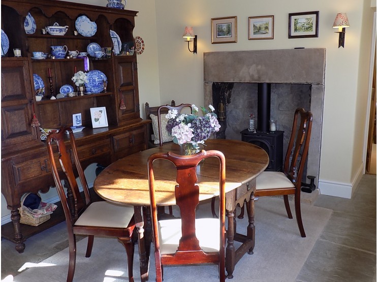 Dining Room 3.66m x 3.32m (12’ x 10’11”) with stone flag floor, small pane glazed window to the front, electric panel radiator and three wall light points. Two feature ceiling beams and recessed Derbyshire stone fireplace with heavy stone mantel, stone hearth and fitted decorative fuel effect electric wood burner style stove. Door off to useful understairs storage cupboard with fitted shelves, quarry tiled floor and a further ledged and braced oak door to rear hall.