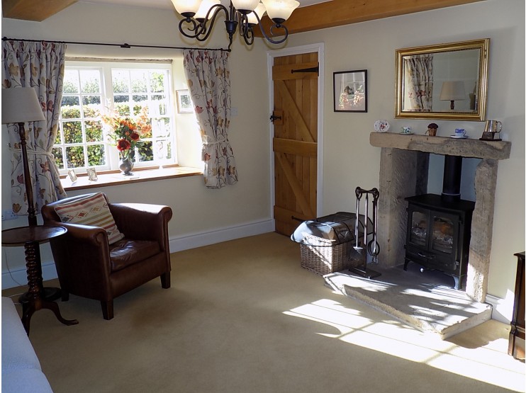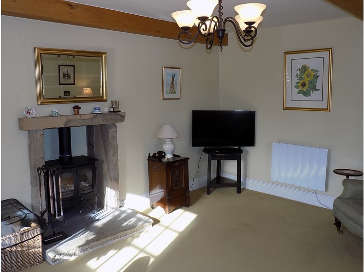 Sitting Room 4.58m x 3.86m (15’ x 12’8”) with small pane sash window to the front and further side window both being deeply recessed with deep wooden sills. Beamed ceiling and most attractive stone fireplace with stone mantle and hearth and fitted log burner room heater stove. Beamed ceiling, electric panel radiator.