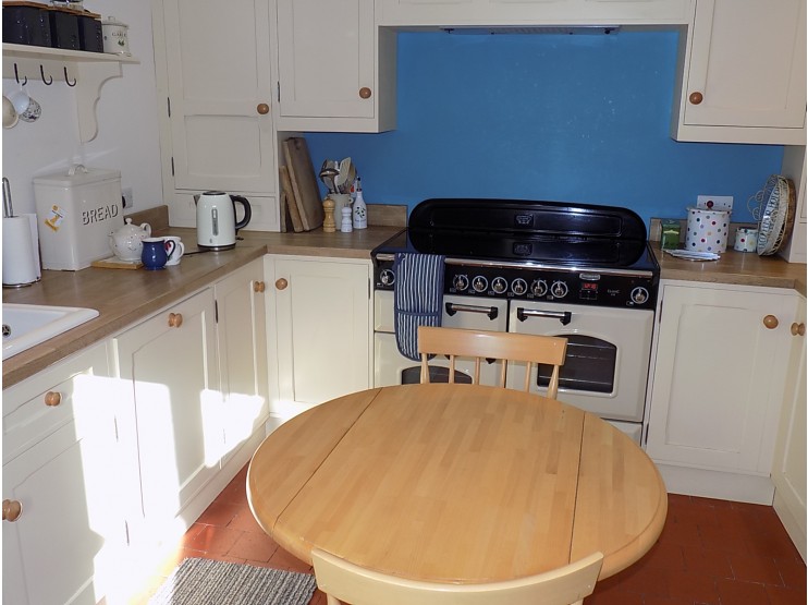 Kitchen 3.29m x 3.28m (10’9” x 10’9”) with quarry tiled floor, electric panel radiator and panelled sealed unit double glazed door to the exterior front. Small pane glazed deeply recessed window. The kitchen is fitted with a comprehensive range of units providing base cupboards and wall cupboards with drawer bank, two tall shelved cupboards with drawers beneath, ample oak effect worktops and integrated appliances including dishwasher, washing machine and fridge freezer. Wide cooker recess with extractor hood over.