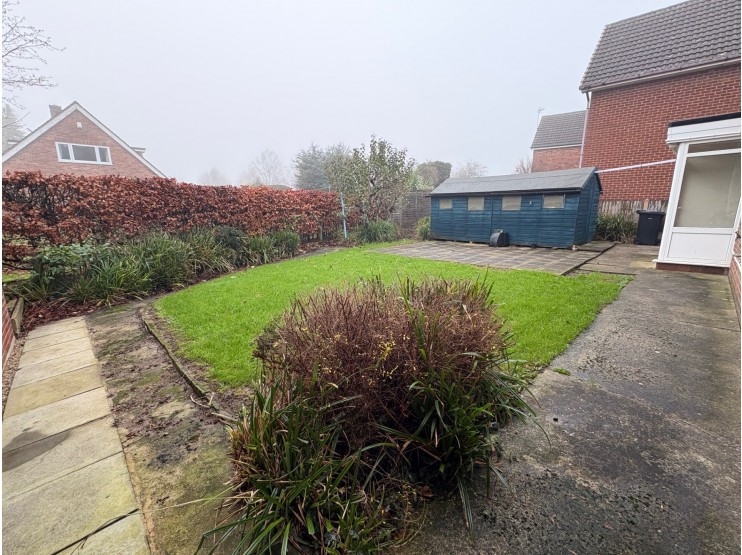 A side pedestrian access with well stocked border leads to the rear of the property where there is a good-sized garden area with shaped lawn, paved patio terrace, planted beds and borders with fruit trees etc. There is a most useful and spacious timber garden shed with electric power connected.