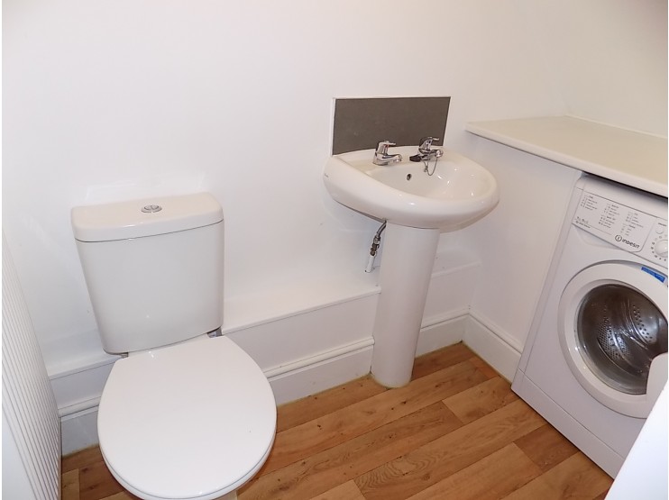 Understairs Cloaks/Utility Area having contemporary fitments in white comprising low flush wc and pedestal wash hand basin with fitted work surface having appliance space beneath and plumbing for washing machine. Single panel central heating radiator.