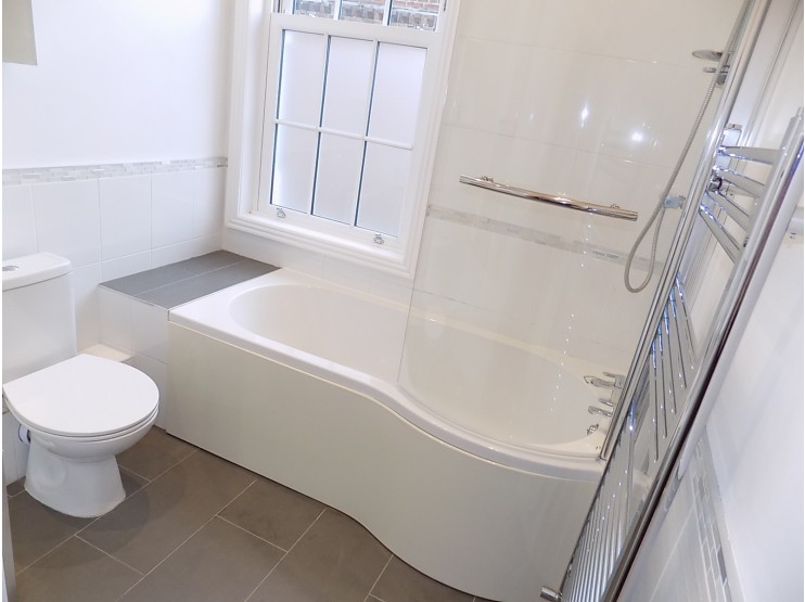 Bathroom with part ceramic tiled walls, ceramic tiled floor and contemporary three-piece suite in white comprising shaped panelled bath with over bath mains control shower, low flush wc and circular wash hand basin set onto hardwood and tiled vanity unit. Tall towel rail radiator, sealed unit double glazed small pane sash window.