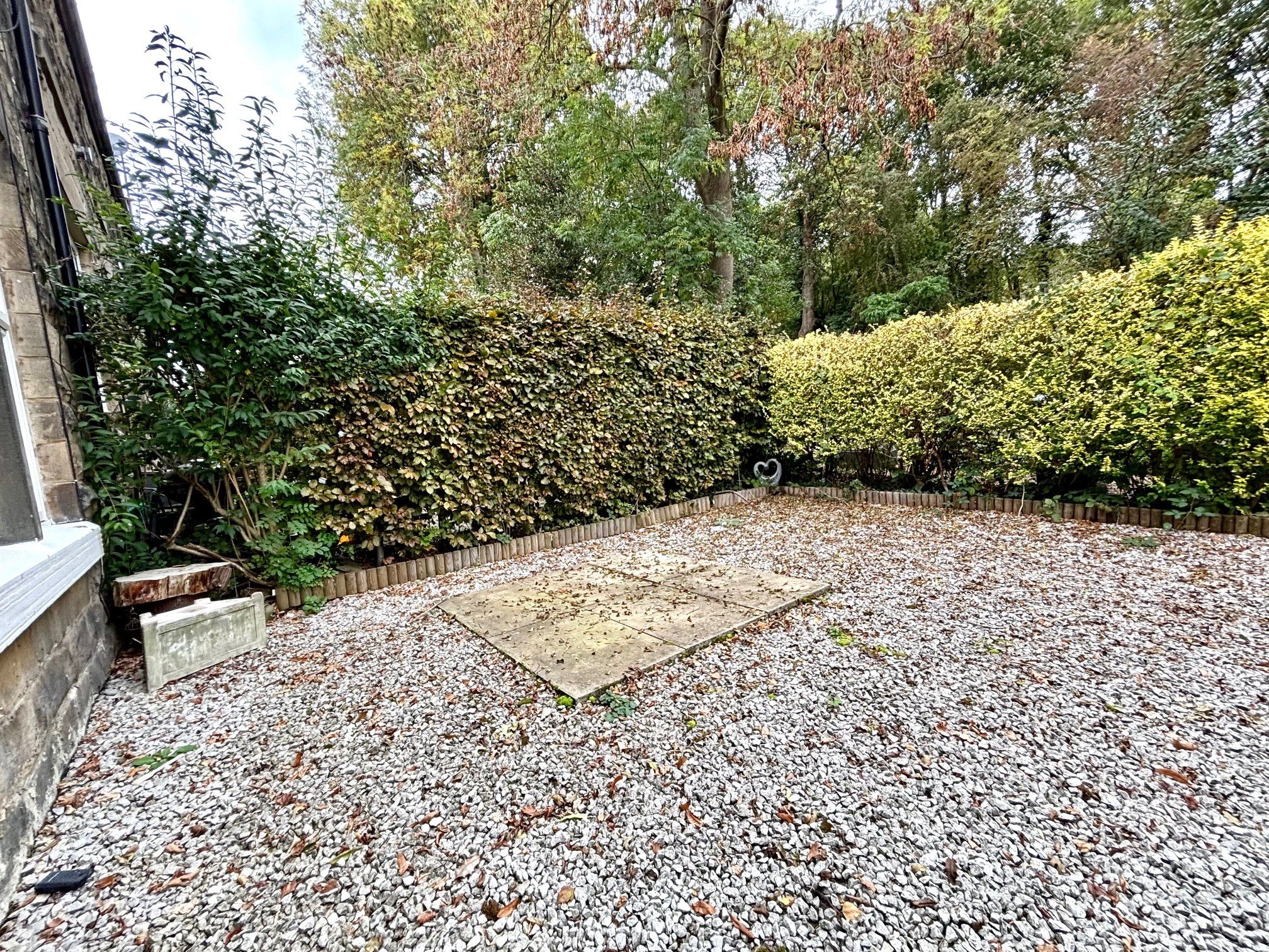 Gravelled front garden, rear yard with two outbuildings. There is no private parking at the property.