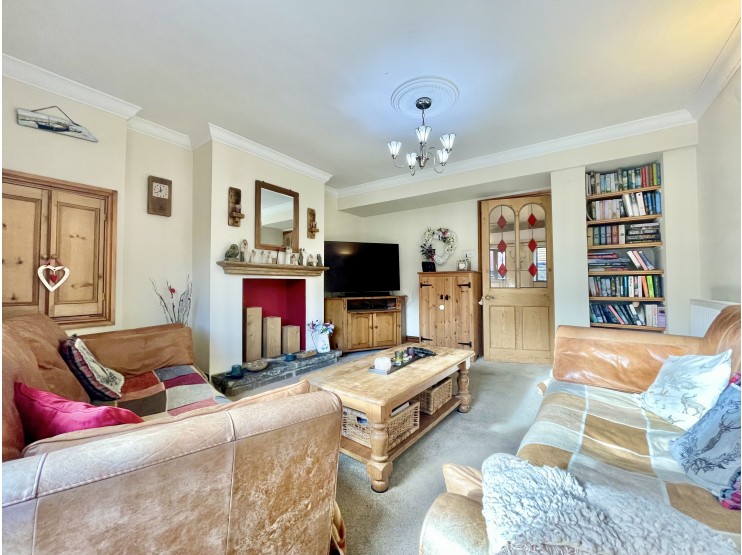 Sitting room – 4.90mx 3.90m (16’ 1” x 12’ 10”) average, a broad front facing double glazed window allowing good natural light.  The room also features a corniced ceiling, centre rose, book shelving, built-in pine fronted cupboard.  As a focal point to the room, a feature fire recess to the chimney breast, pine mantel and raised stone hearth.