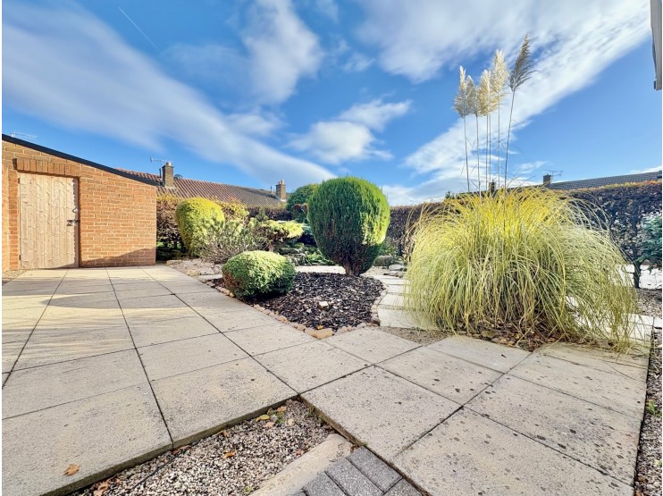 The principally level plot has been landscaped with pleasing effect and ease of maintenance in mind.  The larger gardens are at the rear, bordered on two sides by beech hedging and planted with a number of attractive specimen shrubs and trees, all low growing and maintained. Paved pathways and sitting areas are complimented by pebble display areas.