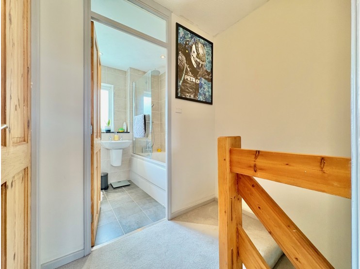 Bathroom – fitted with a panelled bath with mains shower over, fixed drench head, hand held spray and glazed screen, wall hung wash hand basin and WC.  The room is fully tiled in neutral shades, with chromed ladder radiator and rear facing obscure glazed window.