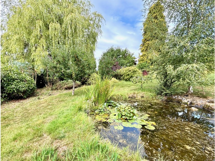 Adjacent to the house, paved patios span the width of the house, garage and car port and from where gentle steps descend through mature shrub borders to a generous central lawn.  A range of interesting landscape provides an array of shrubs, specimen trees which allow height and privacy, and there is also a wildlife pond, plots for cultivation and fruit planting.