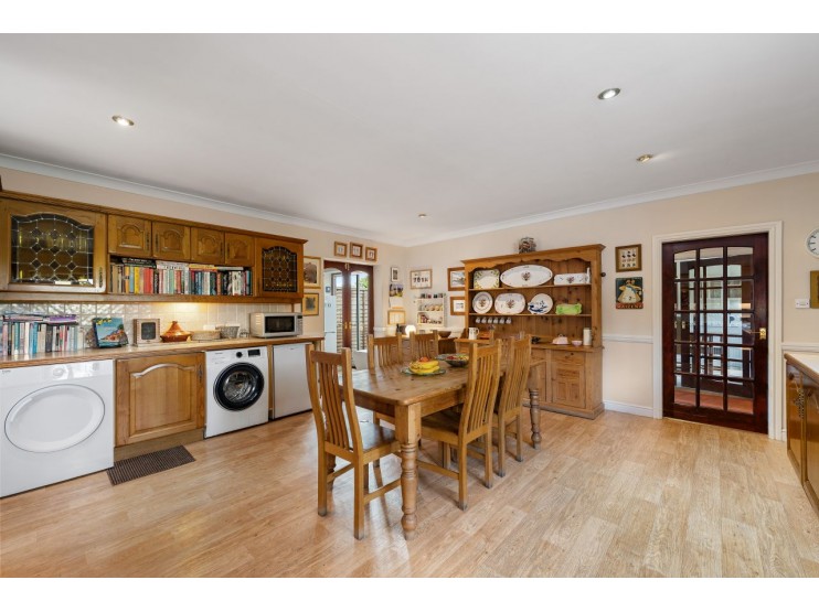 Dining kitchen – 5.54m x 4.96m (18’ 2” x 16’ 3”) an excellent hub of the house with ample space for daily dining and being fitted with an extensive range of oak fronted cupboards and drawers.  There is a 2 ½ bow sink unit, black ceramic hob with extractor hood above and position for other white goods., including plumbing for washing machine and dishwasher.  The window looks across the driveway and garage.  There is a back door for external access and a pair of glazed doors open to a…