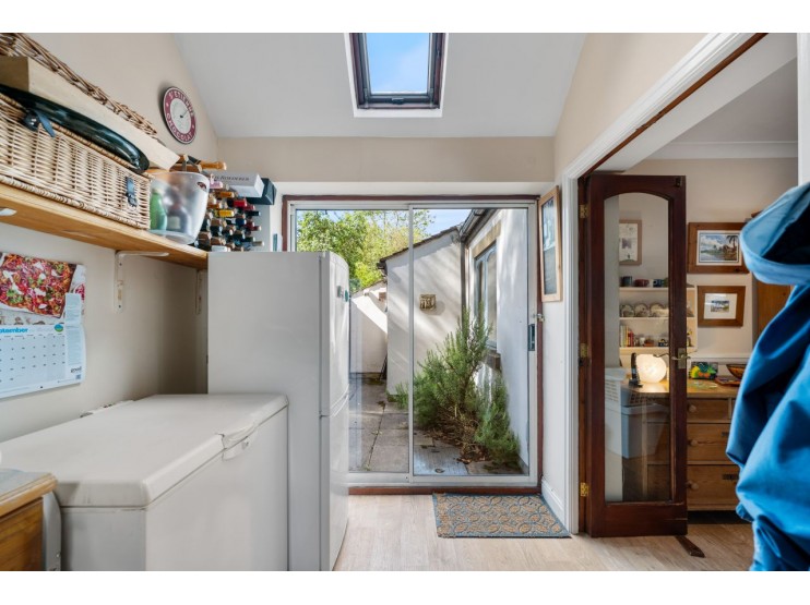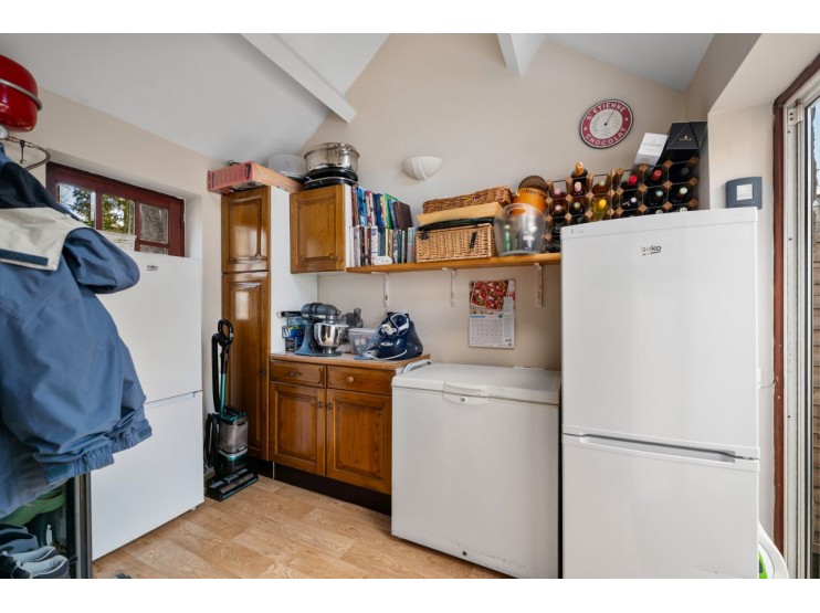 Utility room – 2.94m x 1.412m (9’ 8” x 4’ 8”) fitted with additional storage, work bench, shelving and coat hanging.  Space for further white goods, and to one wall the gas fired condensing boiler which serves the central heating and hot water system.  There is a stable style door to one side, sliding patio door to the other and roof light within the vaulted ceiling.