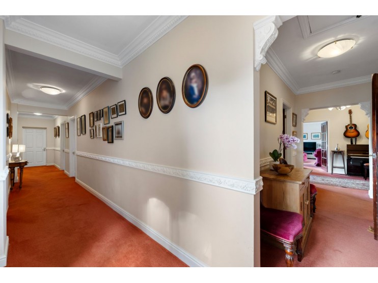 An open porch shelters a broad oak panelled door with brass furniture, which opens to a reception hall with corniced ceiling, an excellent circulation space with access to the principal living areas and with an external glazed door leading through a slim porchway to the patio and gardens.