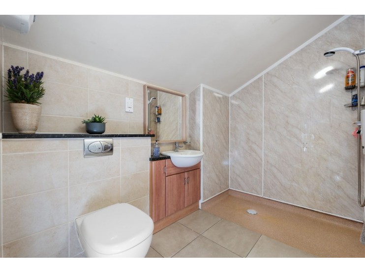 Shower room – 3.83m x 1.82m (12’ 7” x 6’) with an airing cupboard store to one end, and to the other end a full width shower area with non-slip floor and dry boarding to the walls.  There is a fitted WC and wash hand basin with storage beneath, electric shaver point, extractor fan and chromed ladder radiator.