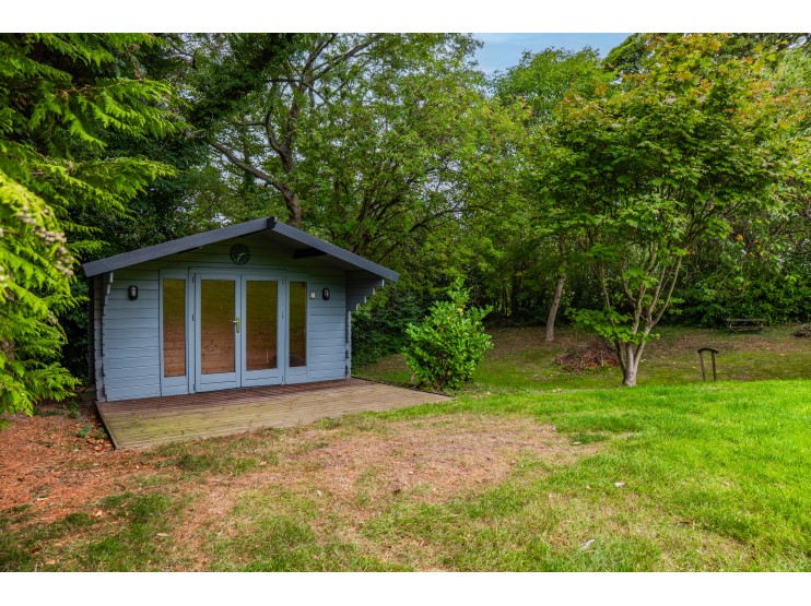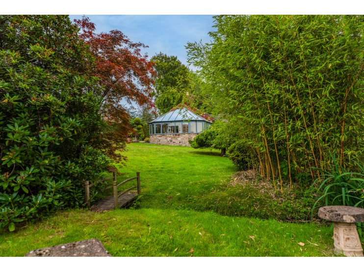 Beyond the driveway the truly stunning gardens stretch behind the garage, across and beyond the front of the property to provide views from all principal rooms. It is clear the gardens have been expertly planned and planted to offer interest and colour throughout the seasons.  The majority is laid to lawn, to the centre of which sits a substantial wildlife pond encompassed by mature planting, ornamental trees, bamboo and azaleas among others. The pond is fed and drained via a grass banked culvert which runs the length of the garden.  Adjacent to the house are attractive patios and herbaceous borders with other features including a timber garden store, separate summer house, small fruit trees across the culvert, that area linked by two ornamental bridges.