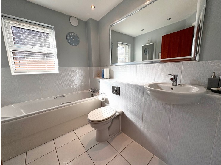 Family Bathroom 2.60m 1.91m (8’6” x 6’3”) overall measurements.  Comprising bath with mixer tap, low-flush wc and wash-hand basin, tiling to half height, tiled flooring, heated towel rail and side aspect UPVC double-glazed window.