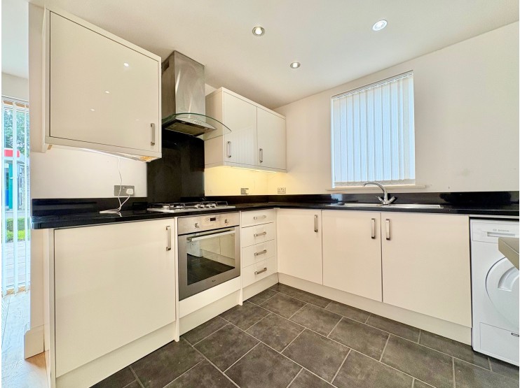 Kitchen – 3.40m x 2.46m (11’ 2” x 8’ 1”) fitted with a good range of modern cupboards, drawers and work surfaces which incorporate a stainless steel sink unit and gas hob with extractor hood over.  There is an integral fridge/ freezer and space for a washer / dryer.  A window faces the side.