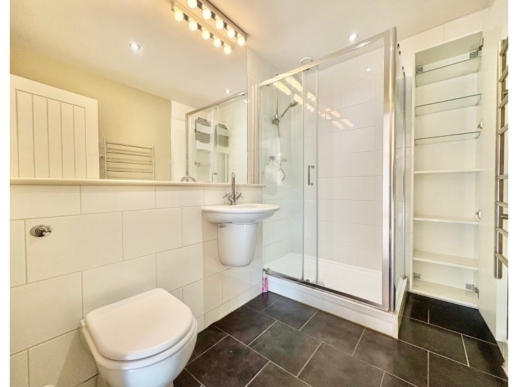 Shower room – fitted with a double width shower cubicle with mains shower and glazed screen and sliding door, wall hung wash hand basin and fitted WC.  There is ample shelf storage and chromed ladder radiator.