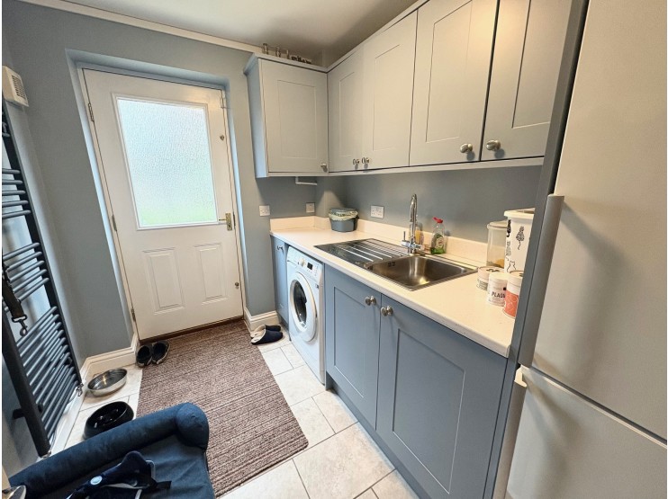 Utility Room 2.69m x 2.02m (8’10” x 6’8”) comprising a modern range of wall and base units in pale blue, work surface with inset stainless steel sink and drainer unit and space and plumbing for washing machine.  Worcester gas central heating boiler set within one of the wall cupboards, space for a fridge freezer. Heated towel rail, tiled flooring and partially double glazed rear entrance door.