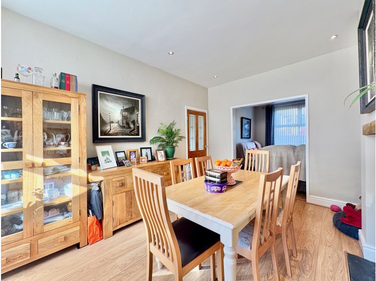 Sitting room – 3.96m x 3.30m (13’0” x 10’10”) with uPVC side by side windows facing the front, feature fireplace with inset electric fire to the chimney breast and laminate flooring.  Opening leads through to the…