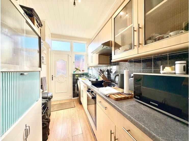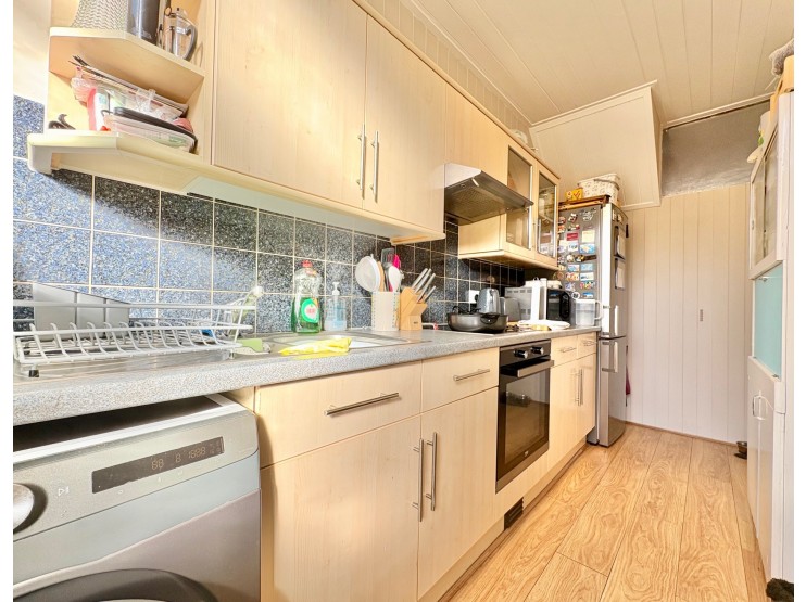 Kitchen - 4.15m x 1.81m (13’8” x 5’11”) fitted with a modest range of cupboards, work surfaces, stainless steel sink unit and drainer.  Built-in single under counter electric oven and Induction hob with extractor hood above, under counter plumbing for a washing machine and tall appliance space for fridge freezer.  Laminate flooring and a uPVC double glazed door allows external access to and from the rear yard.