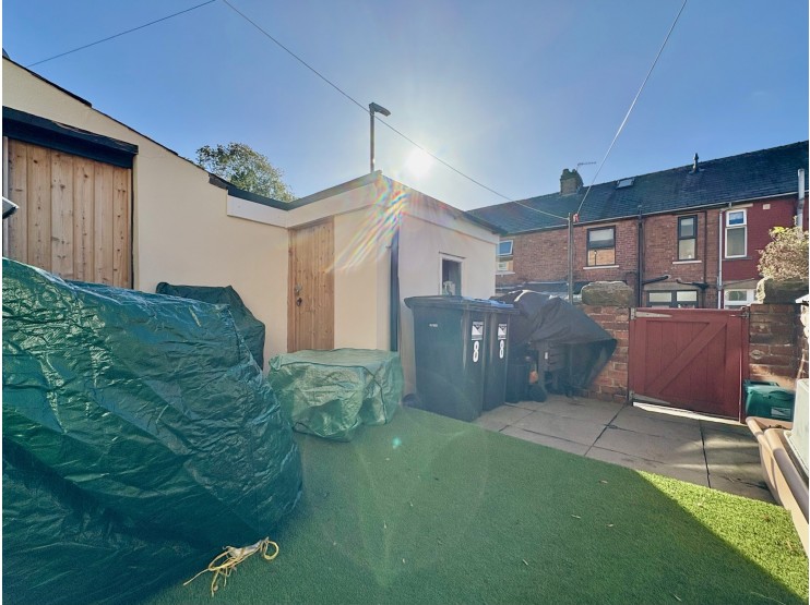 At the rear, the house has the benefit of an enclosed yard with gated access from the service lane.  There is a Outbuilding / Workshop with wooden door, power and lighting and a new (2025) flat roof.  Access from the kitchen is via a few steps, astroturf for low maintenance and further step to a paved patio.  There is also access an outside WC.