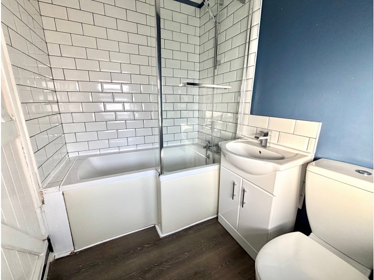 Bathroom - fitted with a white suite to comprise shaped bath with wider shower end mixer tap and shower screen, WC, wash hand basin, and ladder heated towel rail.